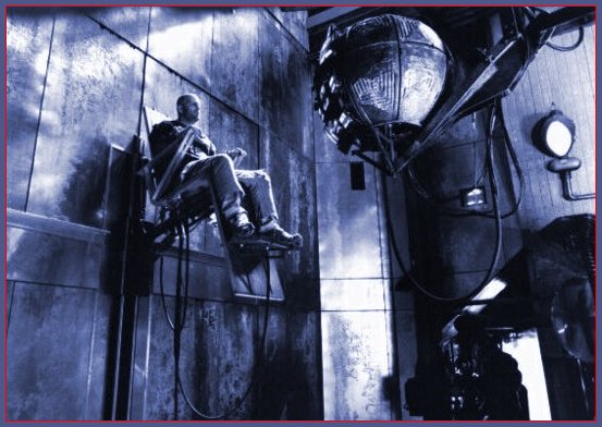 Bruce Willis interrogato dai Gerarchetti della città-formicaio nell'Esercito delle dodici scimmie di Terry Gilliam |